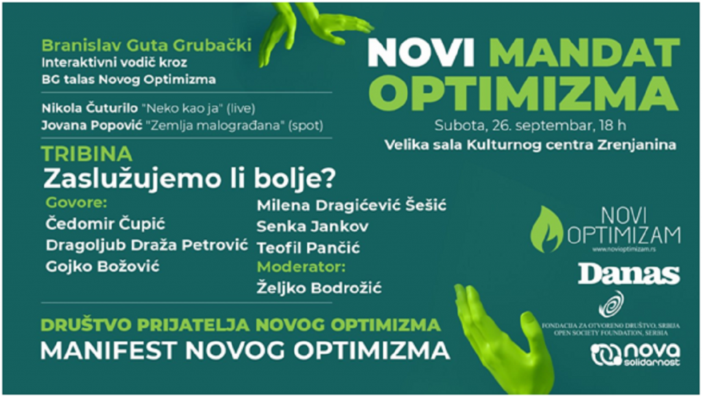 Okupljanje prijatelja i saradnika Novog Optimizma pod nazivom „Novi mandat optimizma“ održaće se večeras u Zrenjaninu, u okviru kojeg će održati tribina „Zaslužujemo li bolje?“, koja će početi u 18 časova u velikoj sali Kulturnog centra.
