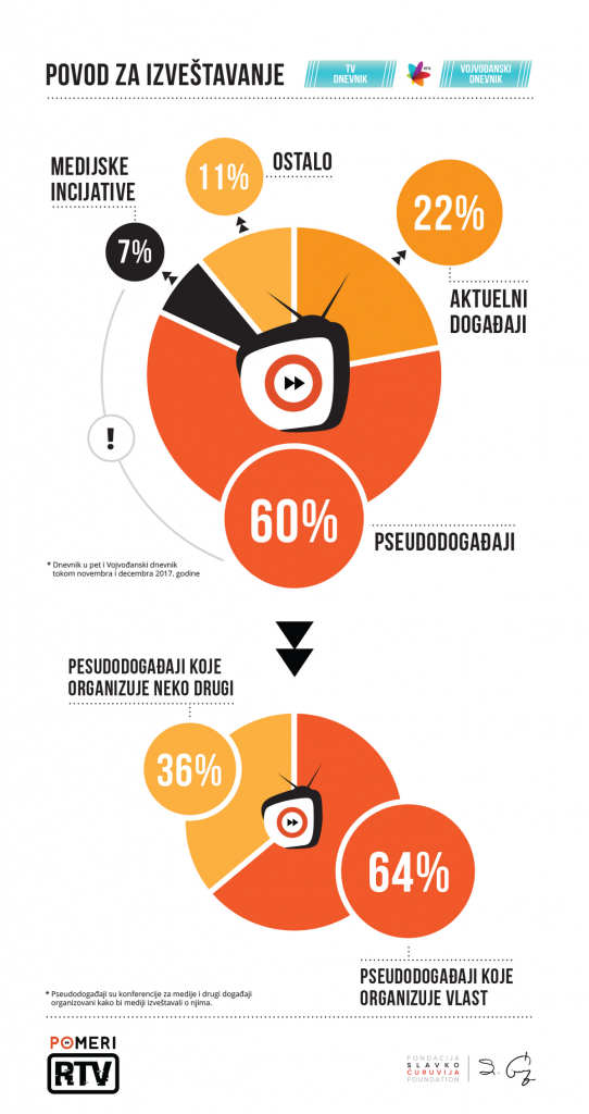 Među pseudodogađajima, u koje se ubrajaju konferencije za novinare, posete fabrikama i drugi događaji koji se odrganizuju kako bi mediji o njima izveštavali, koji su emitovani u „Dnevniku u 17“ i „Vojvođanskom dnevniku“ u posmatranom periodu, najviše je – blizu dve trećine (64 odsto) – onih koje je organizovala vlast.