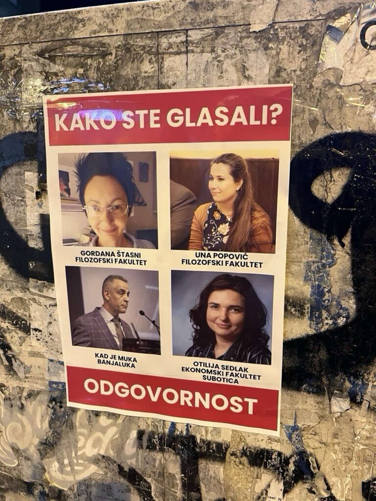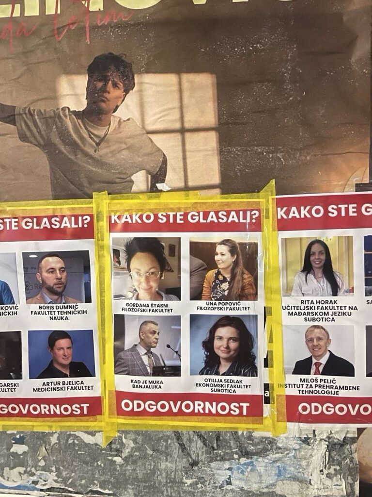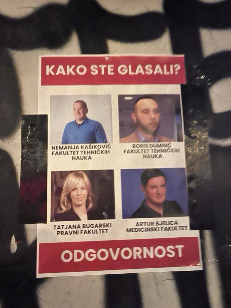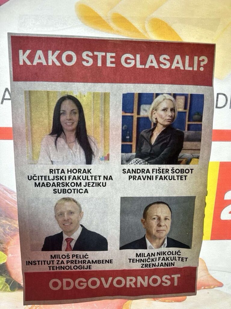 U Novom Sadu su danas osvanuli plakati sa licima i imenima i prezimenima članova Senata univerziteta i pitanjem “Kako ste glasali?” i porukom “Odgovornost”.