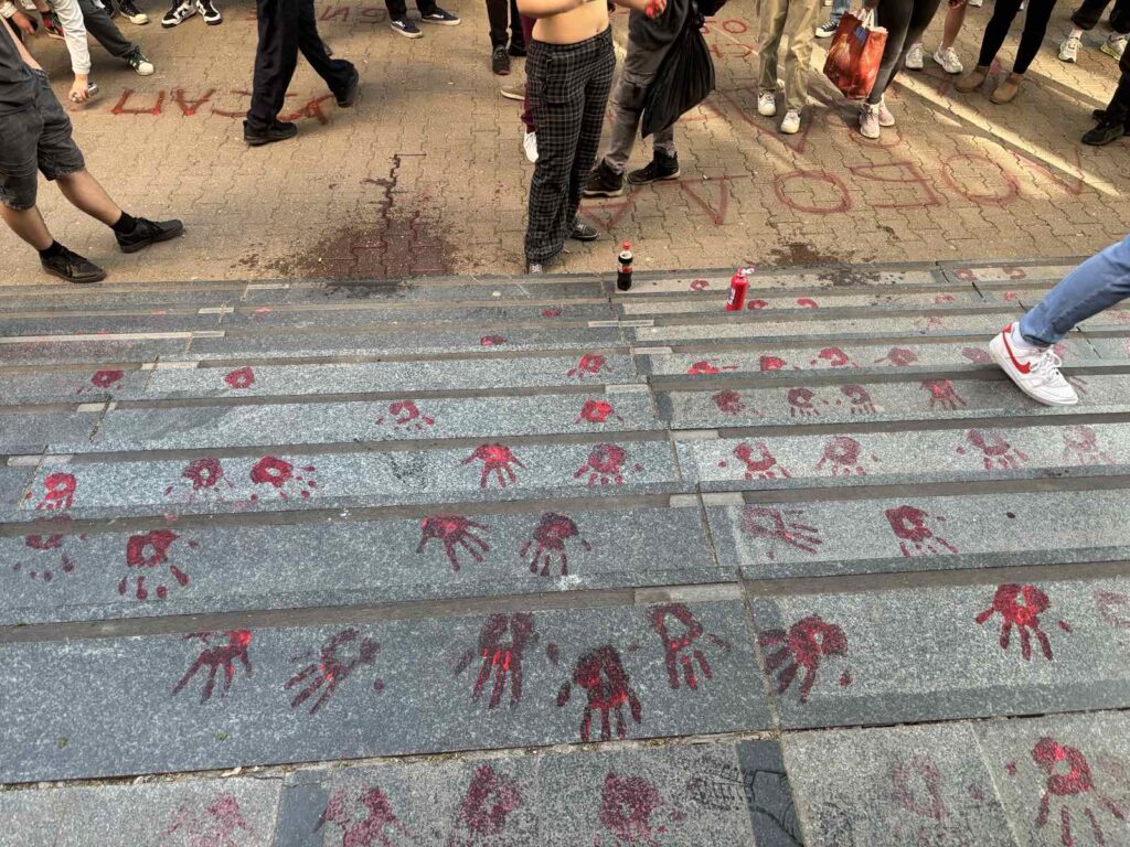 Okupljeni su skandirali “Pustite Veljka”, “Ubice” i pravili buku. Takođe, na stepeništu na ulazu u zgradu ostavili su otiske krvavih šaka.