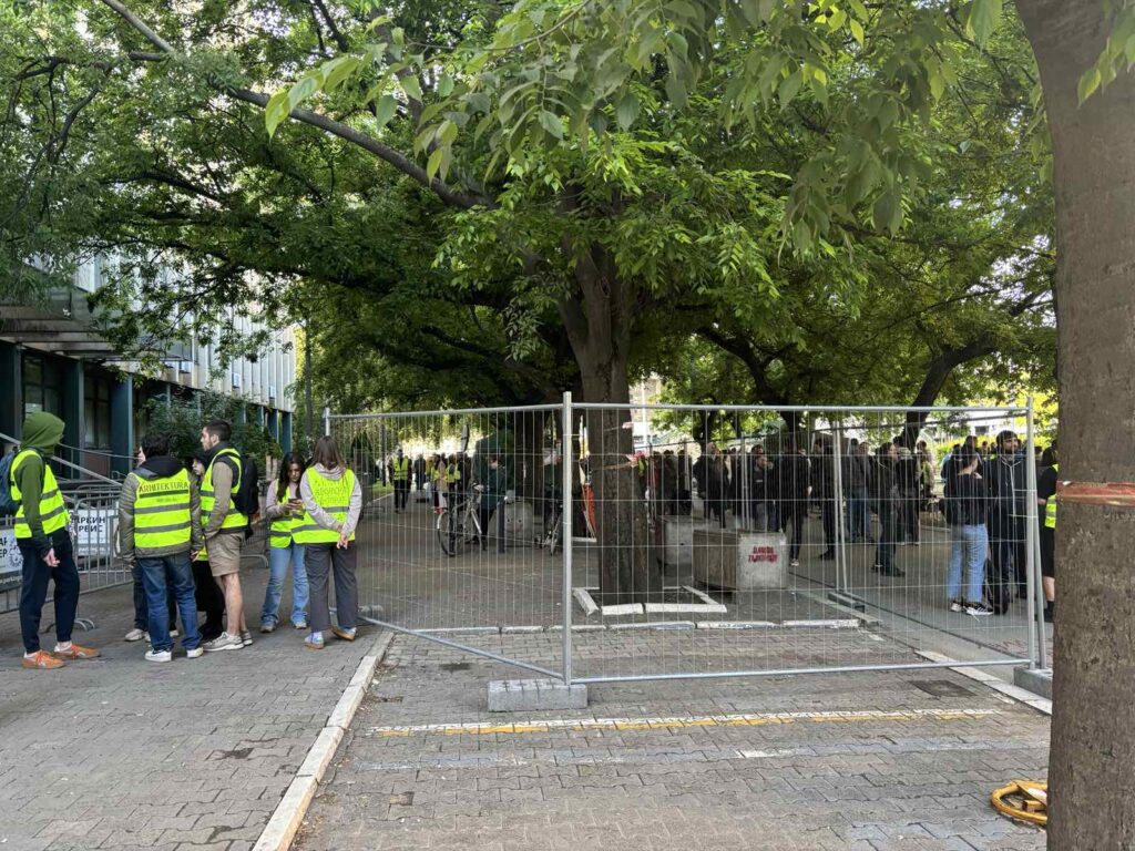 Na glavnom ulazu, iz Sutjeske ulice, koja je takođe blokirana za saobraćaj, postavljena je dodatna ograda pored već postojeće ograde Parking servisa, a na nju je postavljen i transparent s porukom “Sloboda za ljude! Zatvor za neljude!”.