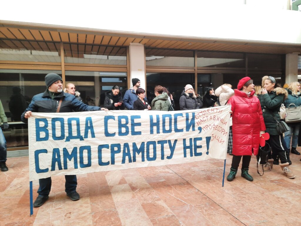 Učesnici sastanka napustili su amfiteatar kroz dva izlaza, a na oba su ih dočekali prosvetari i građani koji su ih izviždali.
