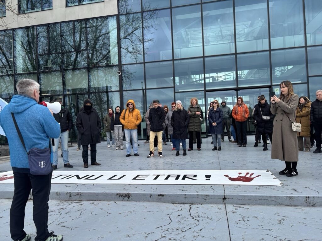 Oni su ispred zgrade RTV-a istakli transparent „Istinu u etar“.