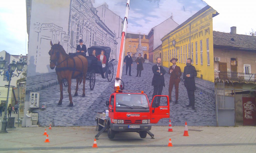 Iz komisije za murale, još jedne od brojnih dimnih zavesa gradske uprave, stvorene da deluje bez ikakvih ingerencija, saznali smo da je ovaj najnoviji mural na zgradi bibliotetke započet i pre nego što je komisija preporučila (fantomskim) podnosiocima zahteva da mural izvedu na nekom drugom, odgovarajućem mestu. Skele su već bile postavljene, kao i u sučaju svih drugih zahteva koji su navodno podnošeni, a u stvari poticali su iz satelitskih nevladinih organizacija koje gradske vlasti nemilosrdno osnivaju isisavajući veliku materijalnu korist na štetu ostalih aktera savremene gradske scene iz različitih oblasti umetničkog stvaralaštva. Slično je bilo i sa muralom kralja Petra na istoimenom bulevaru, navodno najvećim u čitavoj zemlji ili pak sa poluvidljivim muralom Mihajla Pupina, neprimereno slikanim na mermernoj fasadi. Po istom principu, netransparentno, bez ikakve stručne ili javne rasprave, pa čak i protiv preporuka komisije za murale, već nekoliko dana nastaje kvazi-mural kao slika naše urbane propasti u kojoj preovladava najprizemniji partijski voluntarizam. Menjanjem istorije, nedavno u slučaju kič kralja na Trgu republike, a sada i ovog lažnog murala, javni prostor nam se pred očima menja, preoblikuje i završava se proces opšte (p)omame naprednjačkih urbanih promena. Uostalom, isti ljudi i ista vlast, samo tada pod drugim imenom, sredinom je devedesetih godine naredila rušenje legendarne “Žute kuće” u šumarku pored ulaza u Štrand, kao osvetu urbanom Novom Sadu koji nije pristajao na njihove ratne i posleratne pokliče.