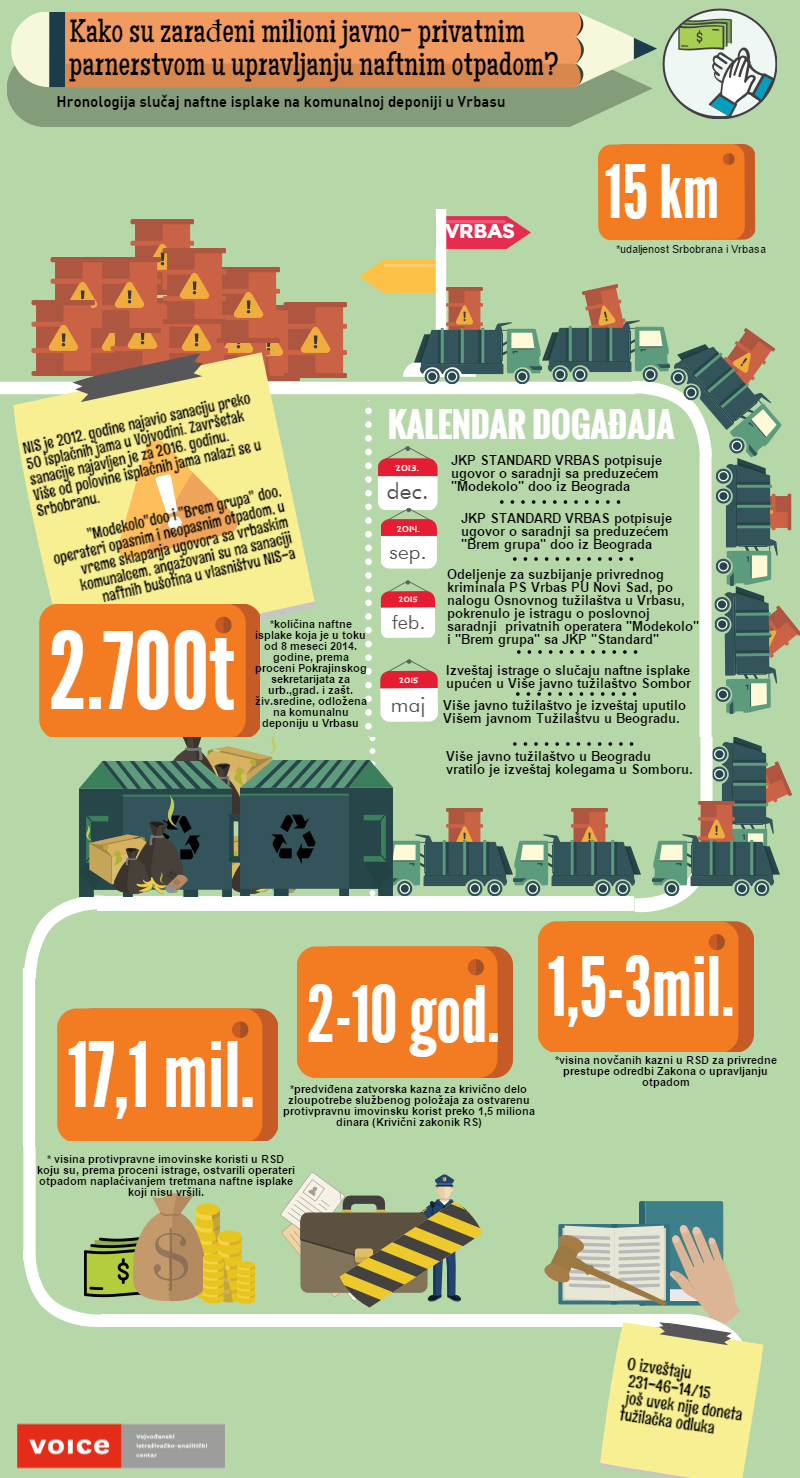 VOICE je u maju objavio istraživački članak o sumnjivoj saradnji privatnih operatera opasnim otpadom sa JKP Standard, koja je rezultirala odlaganjem najmanje 2.700 tona naftne isplake za koju su nadležni tvrdili da je “neopasan otpad”, “zemlja rudarskog kvaliteta”, “pogodan materijal za sanaciju komunalne deponije”, itd. Na pitanja o detaljima poslovne saradnje sa privatnim operaterima otpadom, lagerovanim količinama, analizama koje dokazuju da je otpad tretiran, iz JKP Standard su odgovorili ćutanjem. Čekali smo gotovo pet meseci na odgovore i tek nakon žalbe upućene Povereniku za informacije od javnog značaja, iz JKP Standard odgovorili su da je razlog nepostupanja po zahtevu – neposedovanje tražene dokumentacije. Tražena dokumentacija je, kako se navodi u odgovoru JKP Standard, “predata Policijskoj stanici Vrbas na osnovu zahteva Ministarstva unutrašnjih poslova – Policijska uprava Novi Sad – Policijska stanica Vrbas – Odeljenje za privredni kriminal” još u februaru 2015. godine.