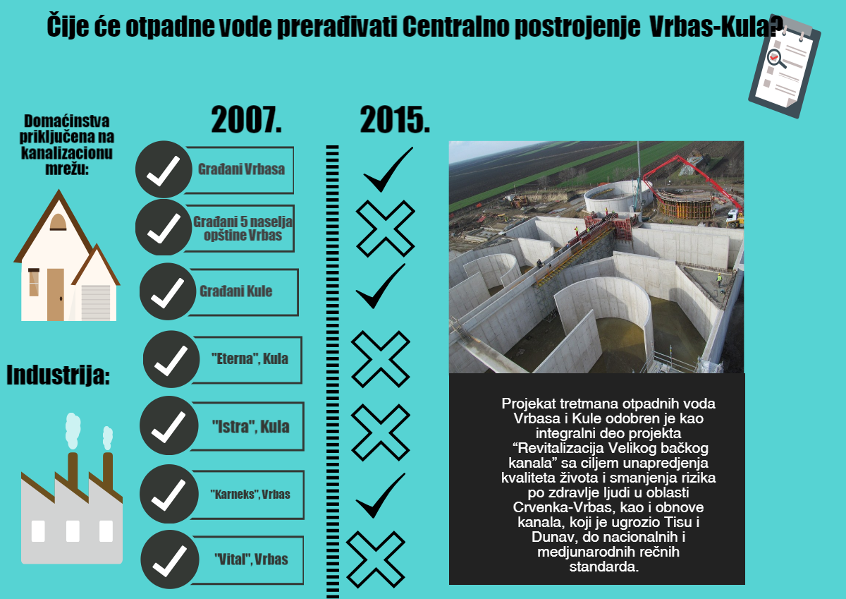 Postrojenje koje će zaustaviti dalje ispuštanje otpadnih voda u Veliki bački kanal, od kojeg su prvenstveno lokalne industrije na potezu Vrbasa i Kule stvorile “najzagađeniji vodotok u Evropi”, projektovano je sa ambicioznim kapacitetom od potrebnih 120.000 stanovnika. Na osnovu tadašnjih analiza zagađenja, koje su prethodile projektu, zaključeno je da su najveće učešće u stvaranju ekološke katastrofe na potezu od šest kilometara Velikog Bačkog Kanala imale kulska i vrbaska industrija – od čak 70 odsto, dok su tek sa 20 odsto “doprinosili” građani i 10 odsto poljoprivredni izvori. Rešavanje decenijskog problema, paraleleno sa izgradnjom savremenog postrojenja, trebalo je da prati izgradnja kanalizacione mreže u pet vrbaskih sela. “Rad postrojenja će biti stabilniji sa većim udelom otpadnih voda stanovništva koje imaju stabilni dnevni model i obim zagađenja”, piše u završnom izveštaju Studije izvodljivosti, koju je izradila Agencija za razvoj lokalne infrastrukture, a koja je predstavljala glavni dokument pri apliciranju za sredstva kod EU. U dokumentu od preko 250 strana u koji je VOICE imao uvid, navodi se da je planirano da “50% ukupnog obima zagađenja dolazi iz dva velika industrijska objekta, a ostalih 50% od stanovništva, insitucija i male privrede”. Na izgradnju kanalizacije obavezali su se tadašnji čelnici vrbaske opštine iz koalicije SRS-SPS-DSS.