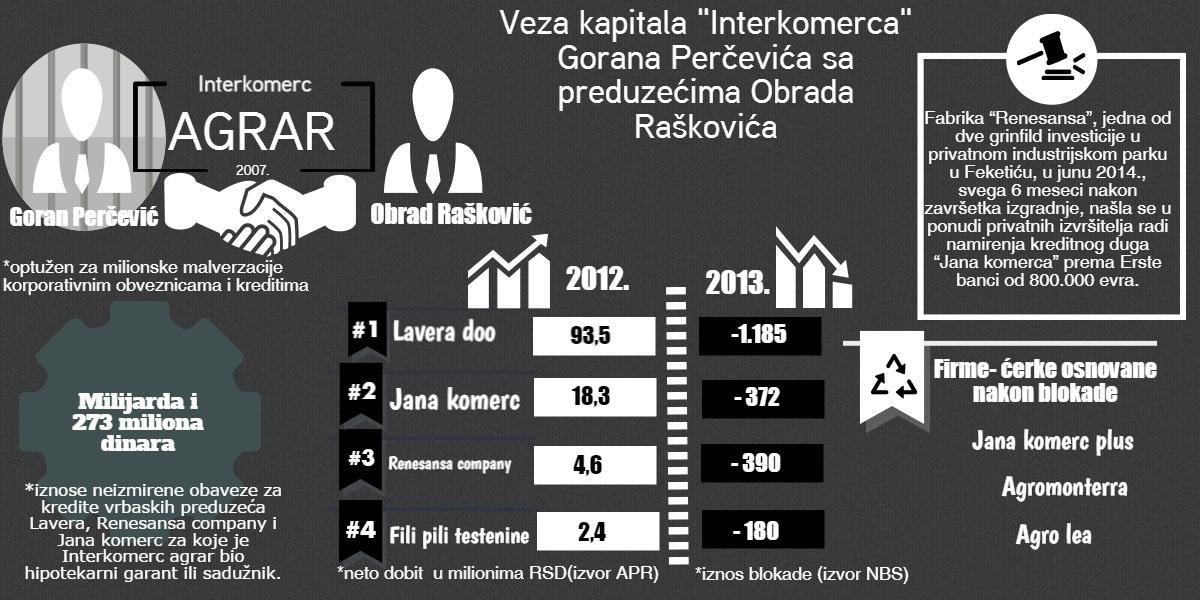 Preduzeće koje povezuje kapital “Interkomerca” a.d. sa firmama Obrada Raškovića i članova njegove porodice je “Interkomerc agrar”. Ovo poljoprivredno preduzeće u ravnopravnom partnerstvu osnovali su Perčevićev “Interkomerc” i Raškovićeva “Renesansa company”. U zajedničko preduzeće “Interkomerc” a.d. uneo je nešto više od 71 miliona dinara u novcu, a “Renesansa company” osnovana 2007. godine unela je zemljište od 1,2 hektara sa mlinom i silosima za lagerovanje pšenice u Pivnicama. Za sedište “Interkomerc agrara” izabran je Vrbas. Adresa preduzeća prvo  je bila porodična kuća Obrada Raškovića, a potom zgrada od preko 1.000 kvadratnih metara koju je njegovo preduzeće “Lavera”d.o.o. 2009. godine kupilo u stečajnoj rasprodaji “Beobanke”a.d. u stečaju. Za kratko vreme, “Interkomerc agrar” je postao značajan faktor u Perčevićevoj kompaniji pokrivajući tržište sa 32 formata robnih marki pakovanog brašna u lancima „Delhaize“, „Idea“, „Merkator“, „Metro“, itd.