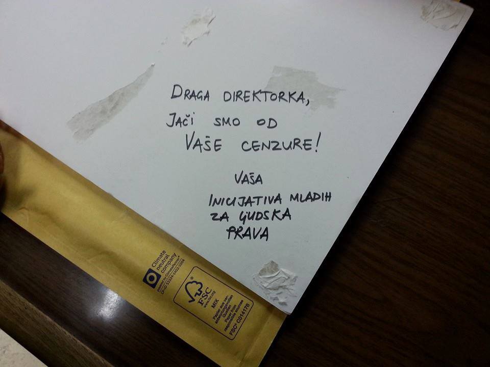 Aktivisti su direktorici Gradske biblioteke poslali jednu od fotografija sa izložbe, sa porukom: „Draga direktorka, jači smo od Vaše cenzure. Vaša Inicijativa“.