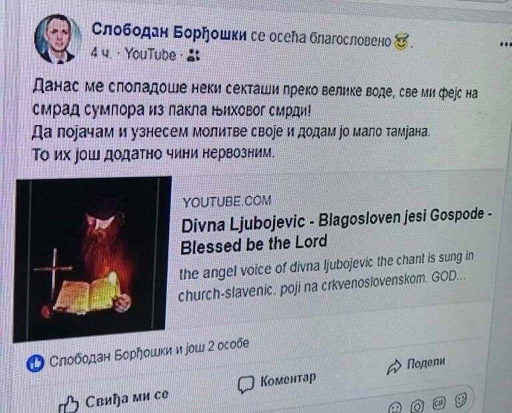 “Danas me spopadoše neki sektaši preko velike vode, sve mi fejs na smrad sumpora iz pakla njihovog smrdi!”, napisao je još Borđoški.