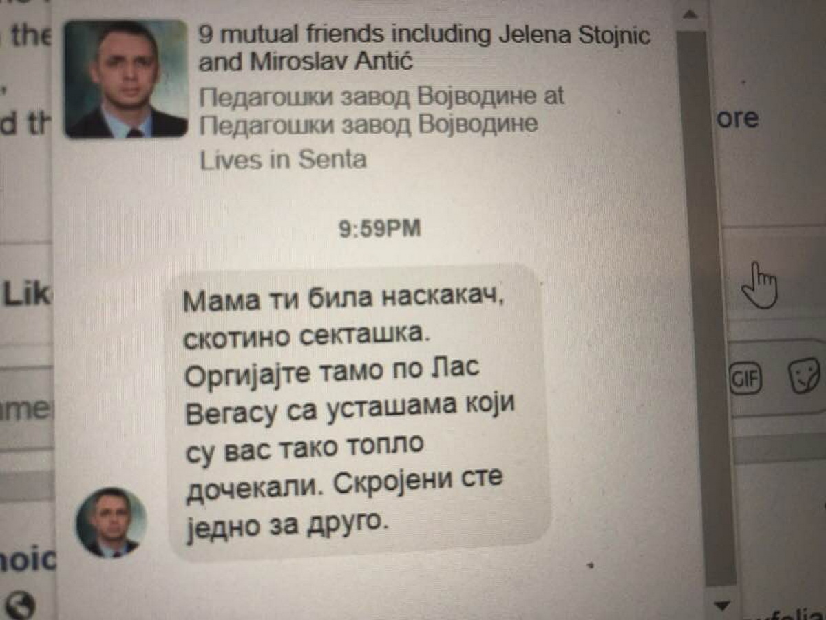 “Mama ti bila naskakač, skotino sektaška. Orgijajte tamo po Las Vegasu sa ustašama koje su vas tako toplo dočekali. Skrojeni ste jedno za drugo”, napisao je Borđoški na Fejsbuk profilu Biljane Knežević.