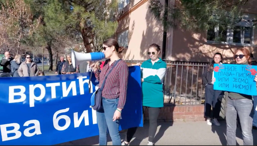 Danas su zaposleni u Predškolskoj ustanovi “Radosno detinjstvo” održali protestni skup ispred upravne zgrade te ustanove, zatraživši između ostalog “da sistem u ovoj državi profunkcioniše”.