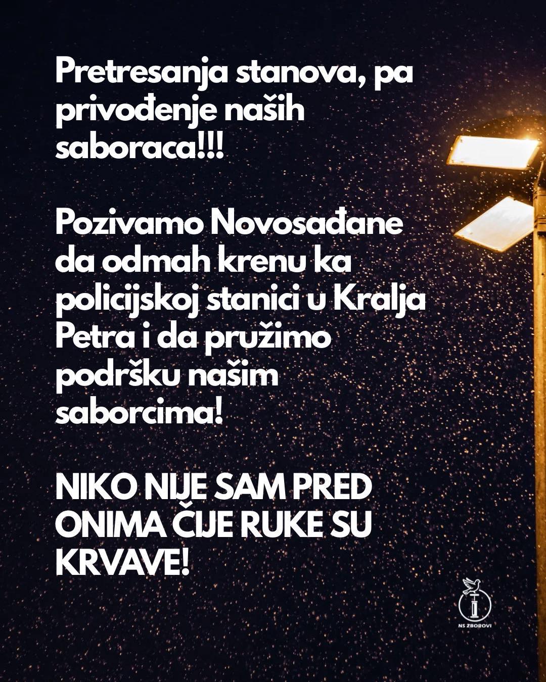 Prema našim saznanjima, priveden je i advokat Srđan Kovačević, nakon što je upravo u ulozi advokata prisistvovao pretresu stana jednog od pripadnika Zborova Novi Sad.