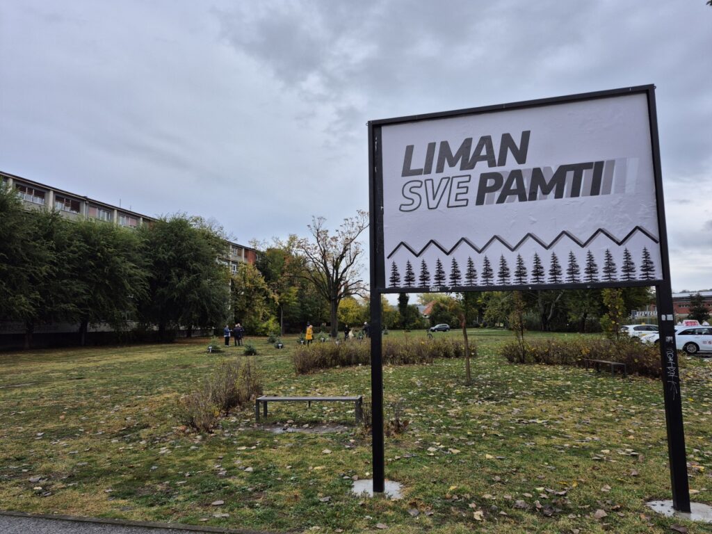 Na velikom bilbordu kraj zelene površine napisana je poruka “Liman sve pamti” sa siluetom krova železničke stanice i borovima.